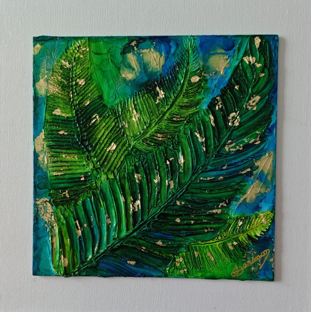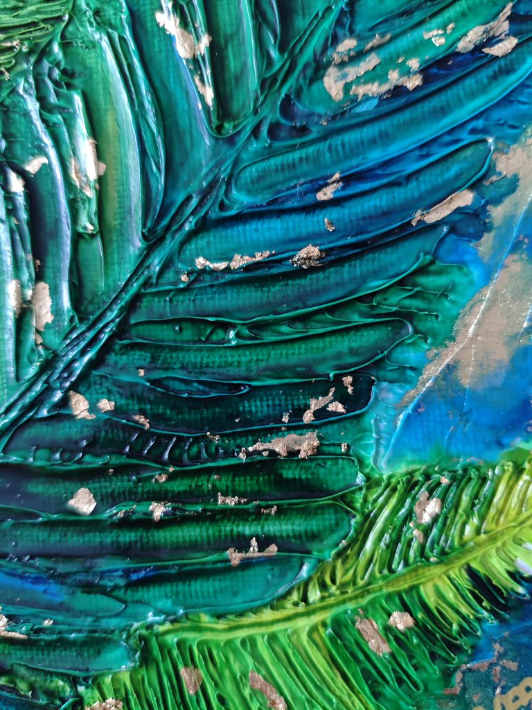 In an interweaving of deep greens and velvety blues, leaves emerge like a breath of nature. The rich, vibrant texture captures the light and holds it within its relief, while touches of gold seem to whisper the passage of time. This painting is an invitation to escape, a fragment of forest, a vegetal silence where light dances upon life.