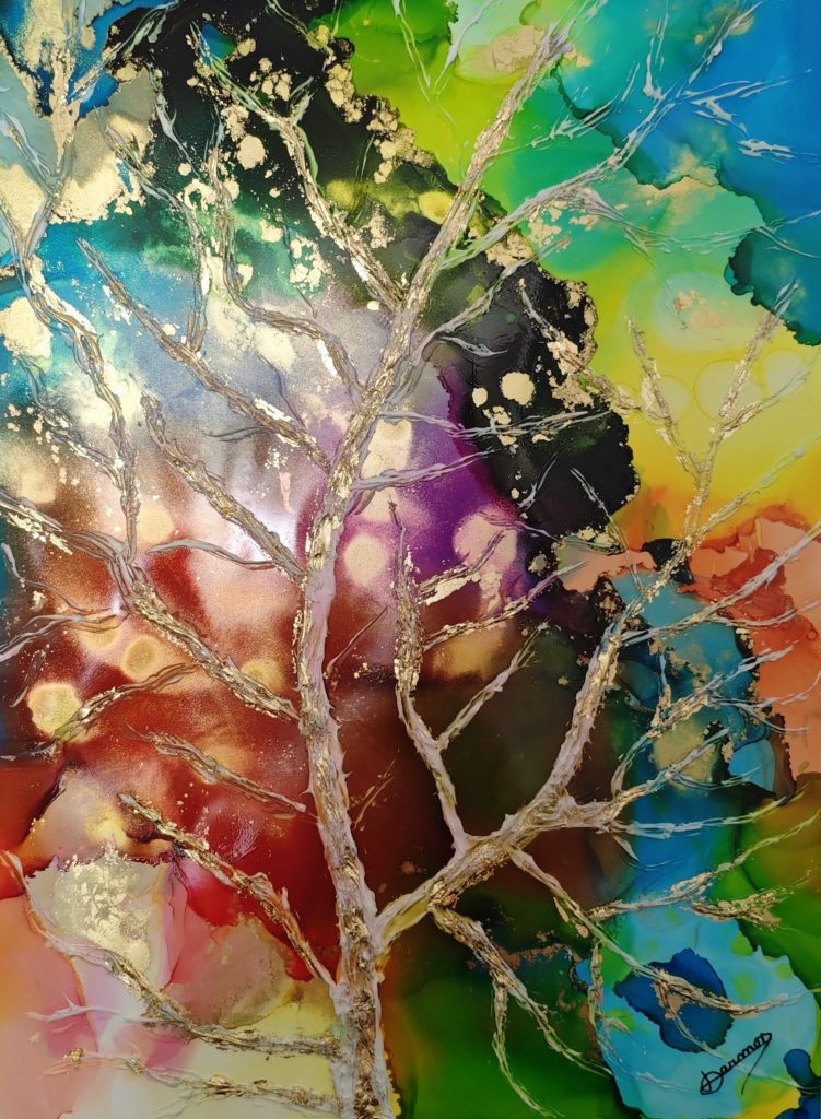 The use of mixed techniques, with a blend of materials and effect paints, provides a variety of contrasts: transparency, mattness and light all at once. Some relief works, using clay and colored resin, give them another dimension.