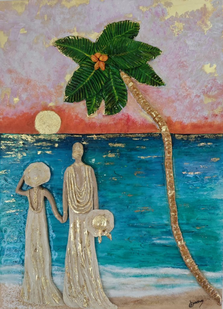 Le mélange et la superposition de texture, l’effet craquelé et l’ajout de feuilles d’or renvoient puissance et émotions aux sujets représentés.