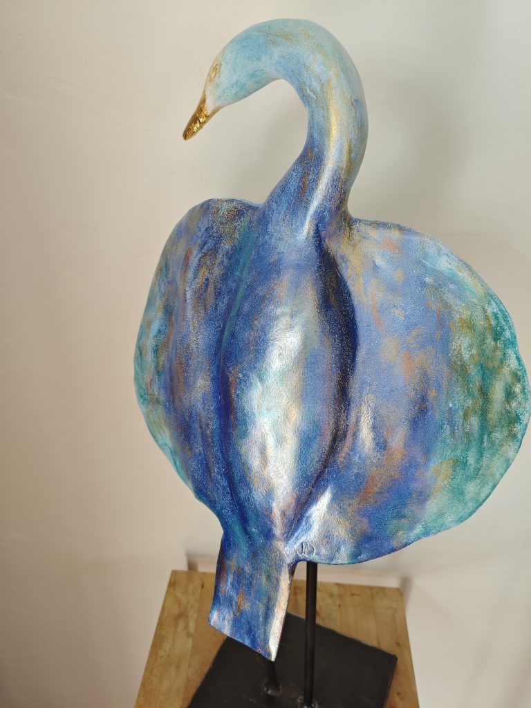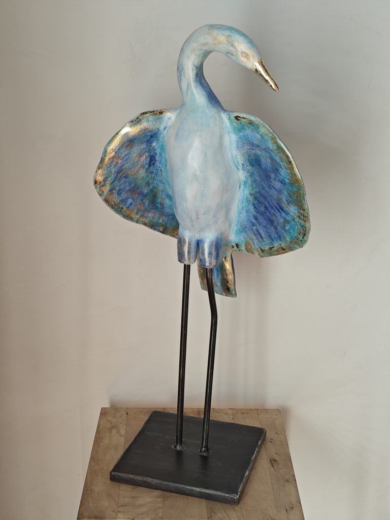 Perché sur ses longues pattes fines, l’échassier veille comme un gardien bienveillant. Son plumage, traversé de reflets bleus et d’or, semble capter la clarté du monde pour mieux la diffuser. Dans la courbe gracieuse de son cou, dans l’élan de ses ailes ouvertes, on devine un souffle de paix, une invitation à regarder plus haut, plus loin.