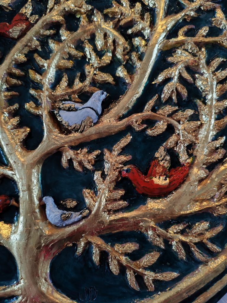 Force et Résilience dévoile un arbre de vie auréolé d’or, dont les branches s’ouvrent comme une prière vers la lumière. Dans son feuillage vibrant, des oiseaux blancs et orange murmurent la douceur du renouveau. L’ensemble respire la puissance calme de la nature : celle qui plie sans rompre, qui s’élève malgré tout, et offre au monde son éclat fragile et éternel