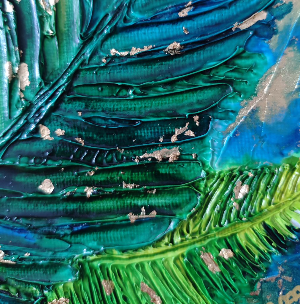 Dans un entrelacs de verts profonds et de bleus veloutés, les feuilles surgissent comme une respiration de la nature. La matière, riche et vibrante, capte la lumière et la retient dans ses reliefs, tandis que les touches d’or semblent murmurer le passage du temps. Ce tableau est une invitation à l’évasion, un fragment de forêt, de silence végétal où la lumière danse sur la vie.